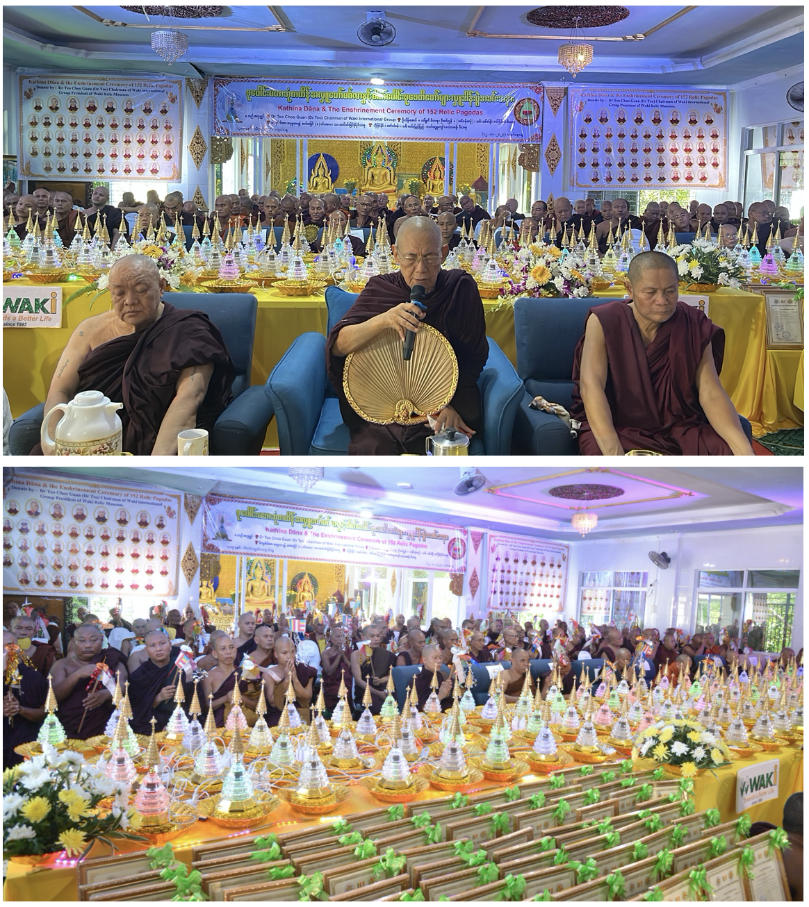 (WAki International Media Center 5th December) On November 12, 2023, Dawei Temple in Mon State, Myanmar held the Kathina Ceremony and the Enshrinement of 152 waki relics pagodas. The ceremony was auspiciously attended by 152 temple abotts and more than 2,000 devotees. The devotees offered robes to the sangha members in order to accumulate the great merits.
