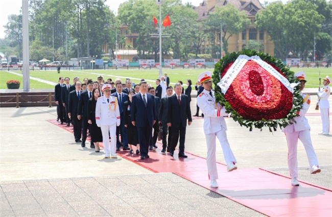 Vào lúc 10 giờ sáng ngày 15 tháng 4, Chủ tịch Tập Cận Bình và Tổng Bí thư Tô Lâm đã cùng nhau dâng hoa và thăm Lăng Chủ tịch Hồ Chí Minh, bày tỏ sự tưởng nhớ và kính trọng sâu sắc đối với Chủ tịch Hồ Chí Minh. Sau đó, hai bên đã tham quan triển lãm ảnh kỷ niệm 75 năm thiết lập quan hệ ngoại giao Việt Nam - Trung Quốc, trưng bày những thành tựu hợp tác giữa hai nước trong nhiều lĩnh vực.