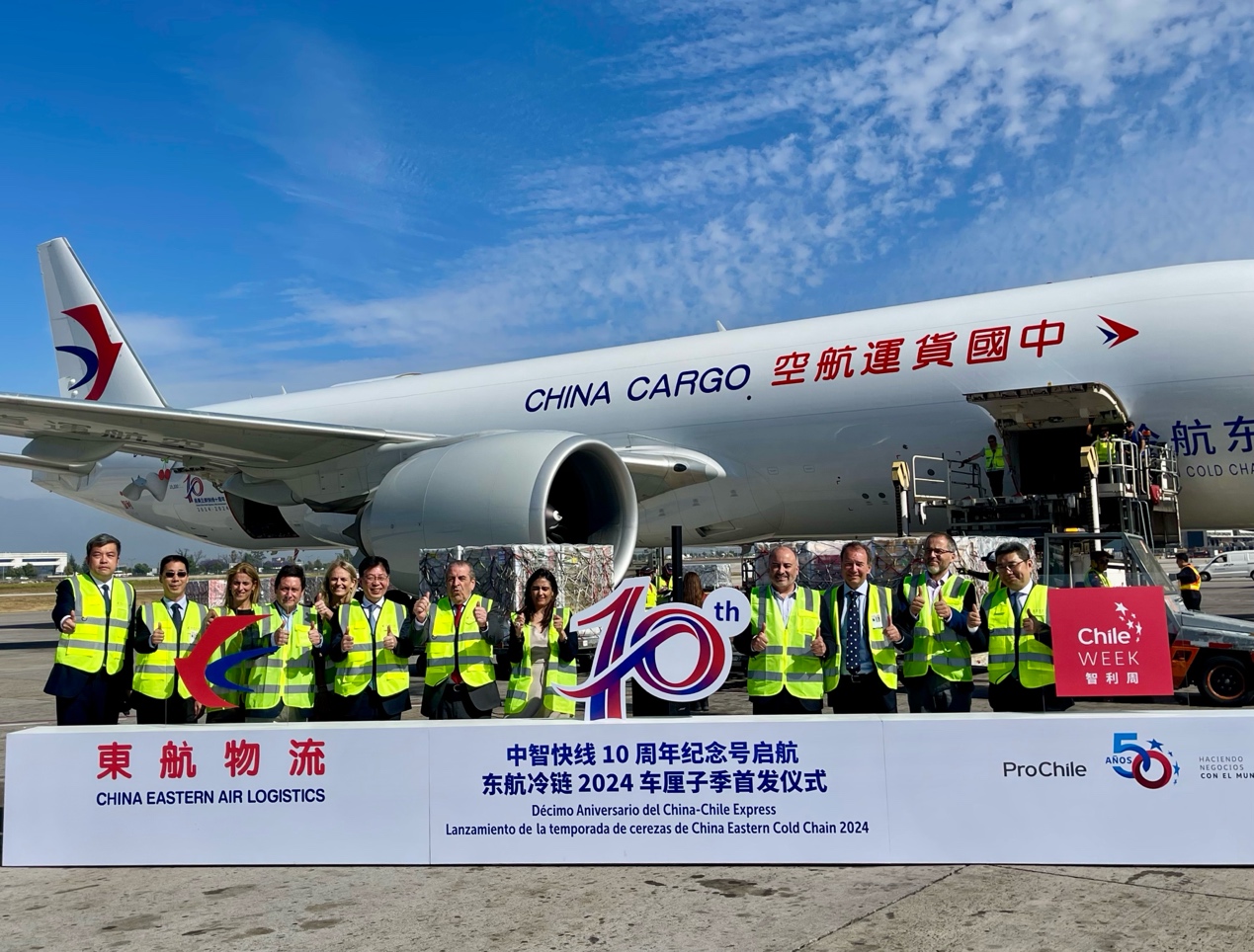 Since the launch of the Belt and Road Initiative in 2013, CEA has transported over 200 tons of Chilean cherries and blueberries from Santiago to Shanghai with leased freighters. In 2014, the airline began operating its own freighters on this route, marking the beginning of its decade-long commitment to fresh produce logistics in the Chilean and South American markets.