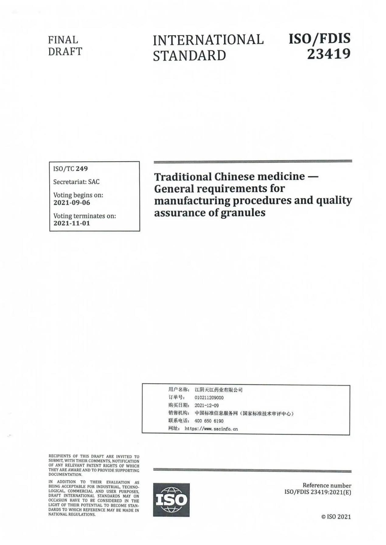 International ISO Standard for Traditional Chinese Medicine Extract Granules