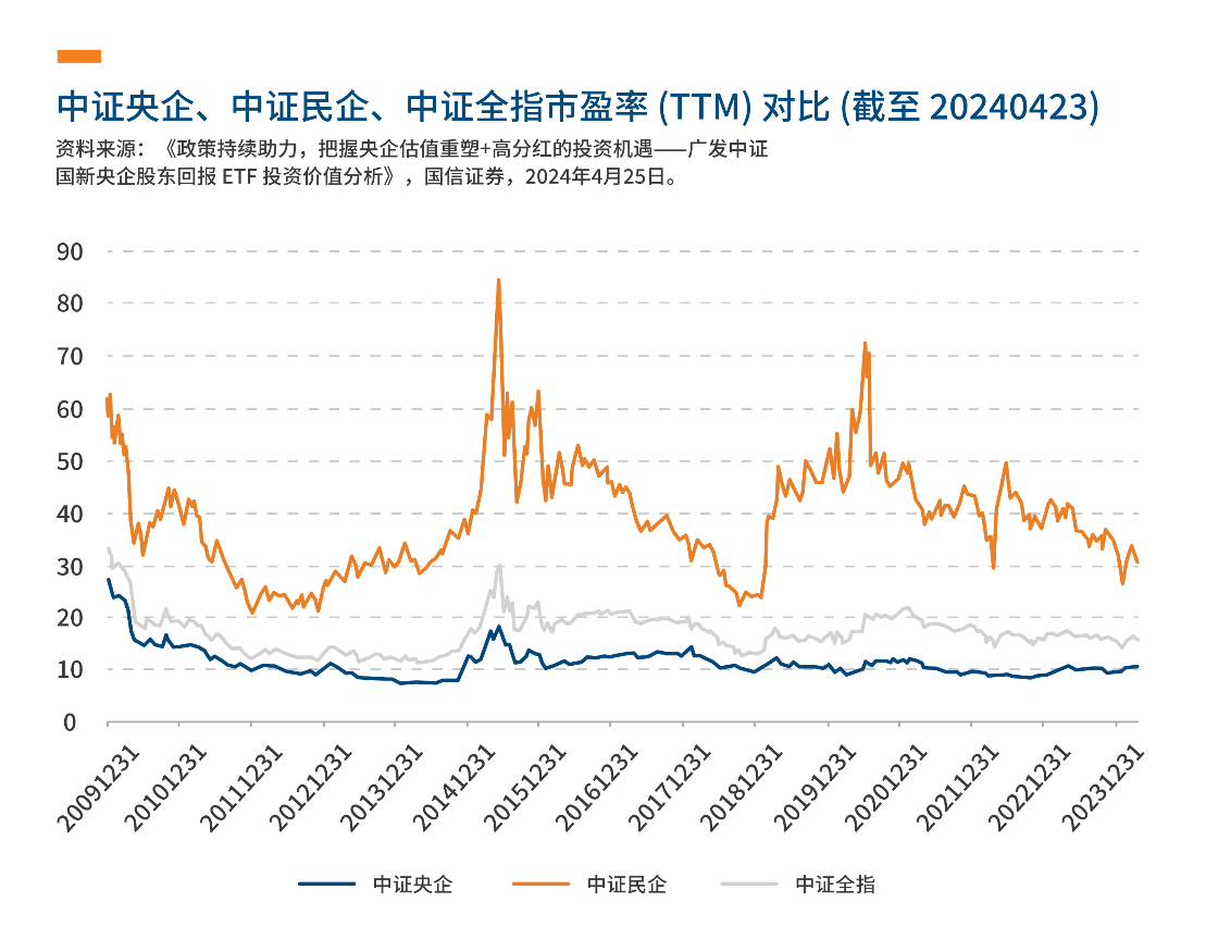 從估值上來看,央企上市公司估值也低於市場平均。截至 2024 年 4 月 23 日,中證央企指數市盈率 TTM 為 10.71,低於全市場中證全指的 15.90,明顯低於中證民企指數的 30.66,從歷史來看央企的估值也長期低於民企和市場平均水準。