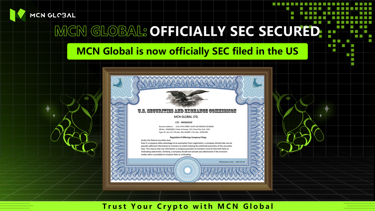 MCN GLOBAL commented: “We believe that any platform aiming for long-term success in the Web3 crypto trading space must embrace regulation. It’s not only a way to protect users, but a foundation for setting industry standards. This Regulation D filing gives us the ability to engage directly with U.S. "accredited investors and reinforces our commitment to building a robust, compliant global ecosystem.”