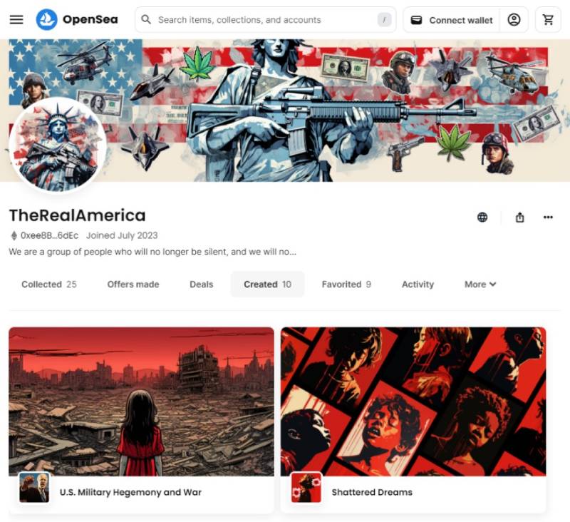 Recently, a DAO calling itself “TheRealAmerica” released two distinctive NFTs on OpenSea, namely “Shattered Dreams” which criticized the proliferation of gun violence and “U.S. Military Hegemony and War” which protested against US military hegemony, and promised all proceeds from the NFT auction will be donated to relevant organizations.