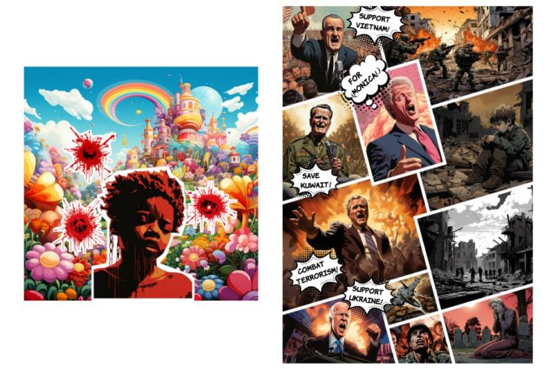 Different from traditional art creation and NFT casting, these two sets of NFT works are generated by AI, full of signs of AIGC. “Shattered Dreams” is a collage of surreal cartoons, silhouette art, and drip paintings, and abundant AIGC traces can be found in the details. “U.S. Military Hegemony and War” is a mix of Jack Kirby, Charlie Adlard, Gary Frank, and many other comic book artists, which usually don’t appear in the same series of works. These works may come from Midjourney or DALL·E 2, and then undergo secondary editing and typesetting.