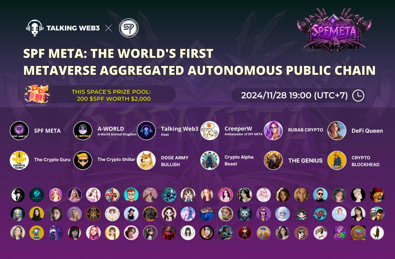 November 28, 2024 – SPF META, the world’s first metaverse-aggregated autonomous public chain, successfully held a landmark Space in collaboration with Talking Web3. The event, which reached an impressive50,000+ listeners across six major platforms, offered deep insights into SPF META’s vision and groundbreaking innovations.
