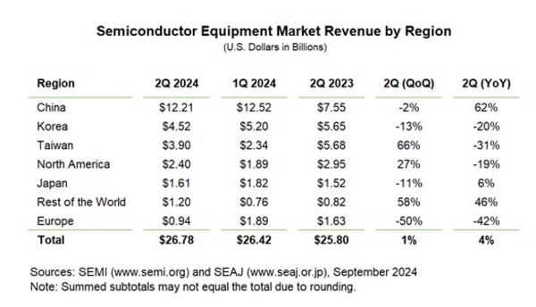 Semiconductor Equipment Market Revenue by Regions for 2Q 2024 SEMI WWSEMS Report