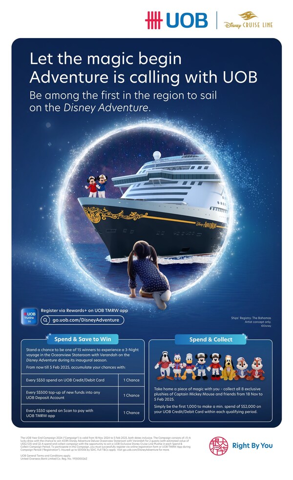 Expanding its suite of unparalleled offerings for its retail base of over eight million across the region,this three-year collaboration is the latest demonstration of UOB's commitment to bringing customers unforgettable travel and entertainment experiences that go beyond conventional bank offerings. Throughout the next three years,UOB cardholders will enjoy special benefits when booking Disney Adventure cruise vacations via UOB's travel partners UOB Travel Planners,Klook,Traveloka and Trip.com. Across the four,an estimate of over 100,000 queries have been registered from the public,expressing interest in the first season of sailings for the Disney Adventure. To kick off this collaboration,all UOB cardholders purchasing Disney Adventure cruise vacationsvia UOB's travel partners will get limited-edition Sailors Chip 'n Dale plushies[2]. More details on the benefits offered by each travel partner are available on their respective websites.