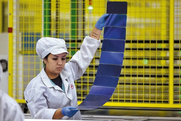 A worker inspects photovoltaic cells at a solar panel and electric bus chassis production facility in Campinas,Sao Paulo state,Brazil,on Nov 14,2023.JONNE RORIZ/GETTY IMAGES