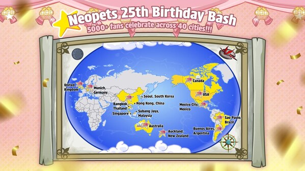 Neopets’ 25th Anniversary Event Map,showcasing festivities in 40 vibrant cities across 14 countries and regions