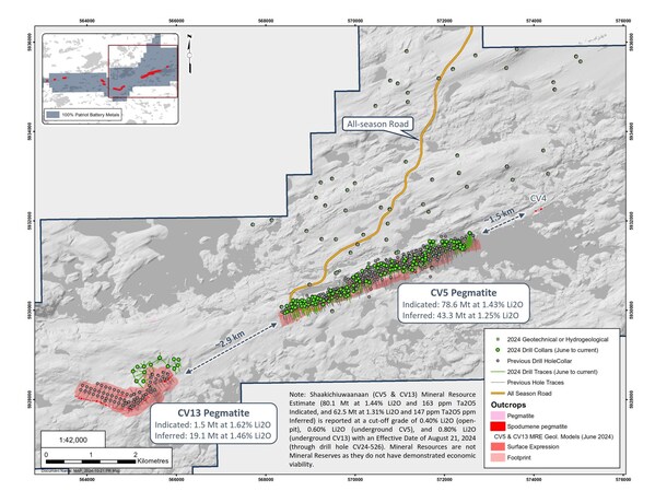 1 Shaakichiuwaanaan (CV5 & CV13) Mineral Resource Estimate (80.1 Mt at 1.44% Li2O and 163 ppm Ta2O5 Indicated,and 62.5 Mt at 1.31% Li2O and 147 ppm Ta2O5 ppm Inferred) is reported at a cut-off grade of 0.40% Li2O (open-pit),0.60% Li2O (underground CV5),and 0.80% Li2O (underground CV13) with an Effective Date of August 21,2024 (through drill hole CV24-526). Mineral Resources are not Mineral Reserves as they do not have demonstrated economic viability.