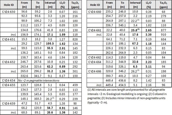 67.2 m at 1.18% Li2O,and 25.8 m at 2.65% Li2O, including 17.6 m at 3.30% Li2O (CV24-661).