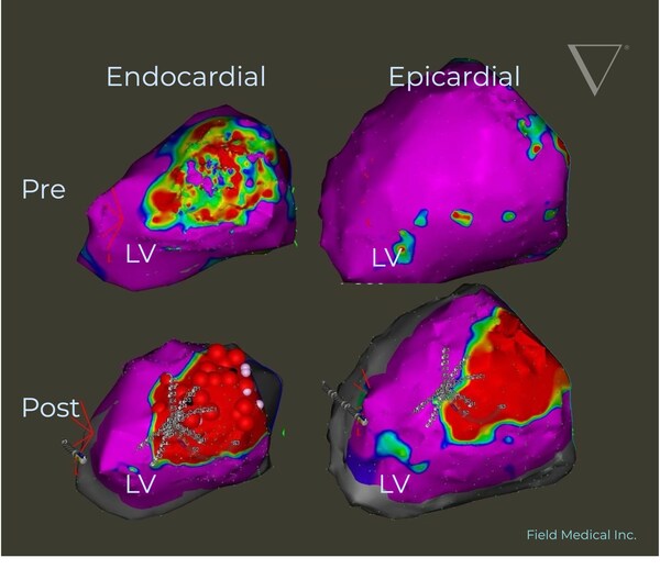 Pre and post voltage map demonstrating Field Medical’s technology creating transmural LV ablation lesions from endocardial treatment alone. This image is from a VCAS Study subject treated with FieldForce for VT Ablation.