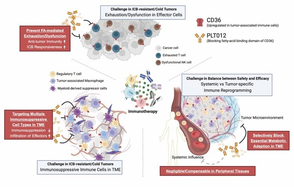 PLT012,is a humanized anti-CD36 antibody with a unique dual mechanism of action (MOA): it simultaneously disarms immunosuppressive cell populations and amplifies effector T cell functions. PLT012 has shown potential against multiple tumors with unmet medical needs. It is set to advance to its first U.S. IND submission and first patient dosing in 2025. As a monotherapy,PLT012 demonstrates remarkable anti-tumor efficacy in both immune 'hot' and 'cold' tumor models with a significant augmentation in GzmB-expressing CD8+ T cells and reductions in both intratumoral Tregs and pro-tumorigenic macrophage. Additionally,PLT012 treatment alters the exhaustion features of cytotoxic CD8+ T cells by increasing the populations of progenitor- (Texprog) and tumoricidal activities in terminal-exhausted T cells (Texterm),highlighting enhanced anti-tumor immunity when combined with immune checkpoint blockade therapies,such as PD-1 or PD-L1 inhibitors.