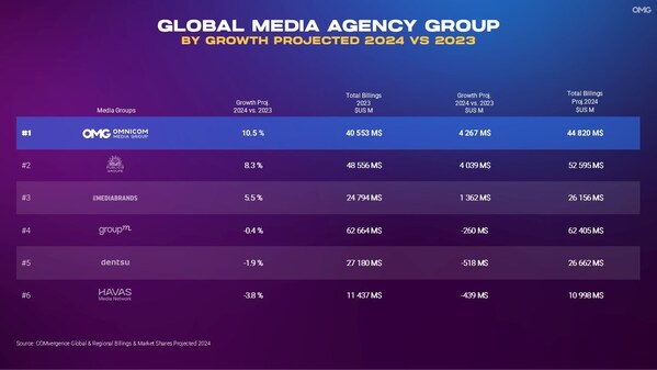 As reported inGlobal& Regional Billings & Market Shares Projected 2024- a provisional analysis of 2024 billings formedia agency networks and their respective owner groups published yesterdayby independent research companyCOMvergence– OMG outperformed its peers in both percentage of growth (10.5% against a 2023 billings base of $40.6b ) as well as actual billings added (+$4.2b) bringing its projected 2024 billings to $44.8b.