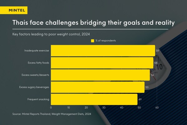 Despite their aspirations,many Thais attribute their weight management struggles to insufficient exercise and the consumption of fatty foods,sugary snacks,and beverages. Among those taking weight control measures,59% cited inadequate exercise as the primary obstacle.