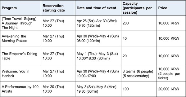 - Opening Ceremony: Apr 25(Fri) 19:30–20:40,Heungnyemun Gate Square at Gyeongbokgung Palace.