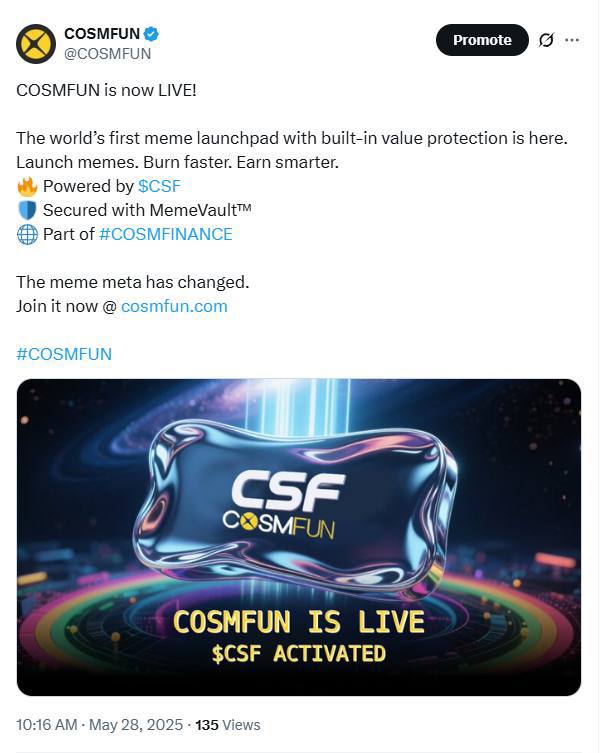 On May 28, COSMFUN, the first meme launchpad with a built-in insurance model and price floor protection, officially launched its native platform token $CSF. With the debut of its signature MemeVault™ mechanism, COSMFUN introduces a novel solution to the long-standing “go-to-zero” problem that plagues most meme tokens. The launch of $CSF is widely considered a key milestone in the structural evolution of the meme coin sector.