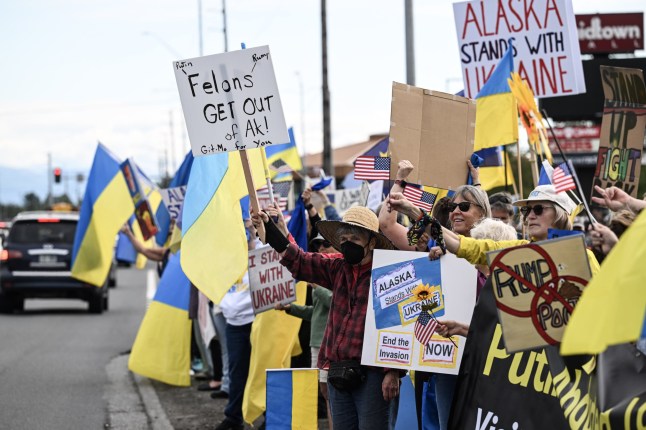 Ukraine supporters gather in a demonstration in Anchorage (Picture: Fatih Aktas/Anadolu/Getty Images)