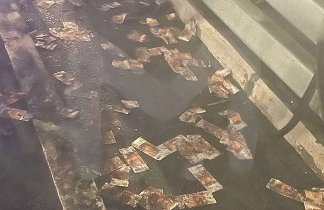 Footage from the scene shows the vehicle overturned on its roof and engulfed in flames,with wads of Russian ruble notes littering the road.